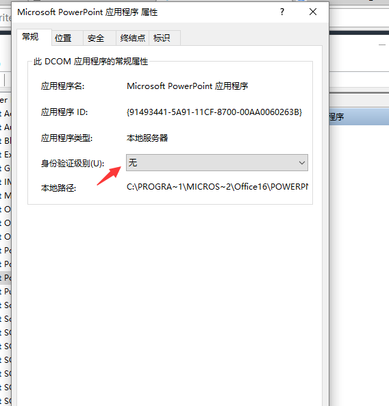 3、右键打开“属性”对话框,点击“常规”“身份验证改为无,”“标识”选项卡,选择交互式用户;点击“安全”选项卡,“启动和激活权限”、“访问权限”选择自定义