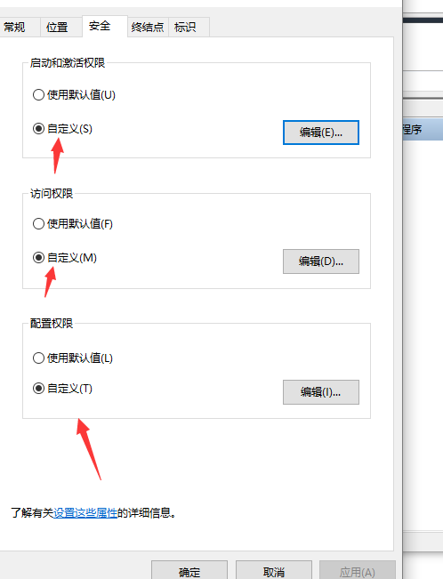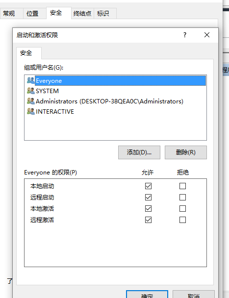4、编辑启动和激活权限权限的自定义选项,将Everyone添加进去,给与本地激活和远程激活的权限,访问权限相同