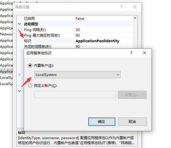 5.如果将上面设置完成还不行,就在iis的应用池找到当前项目右键选着高级设置将标识改为LocalSystem